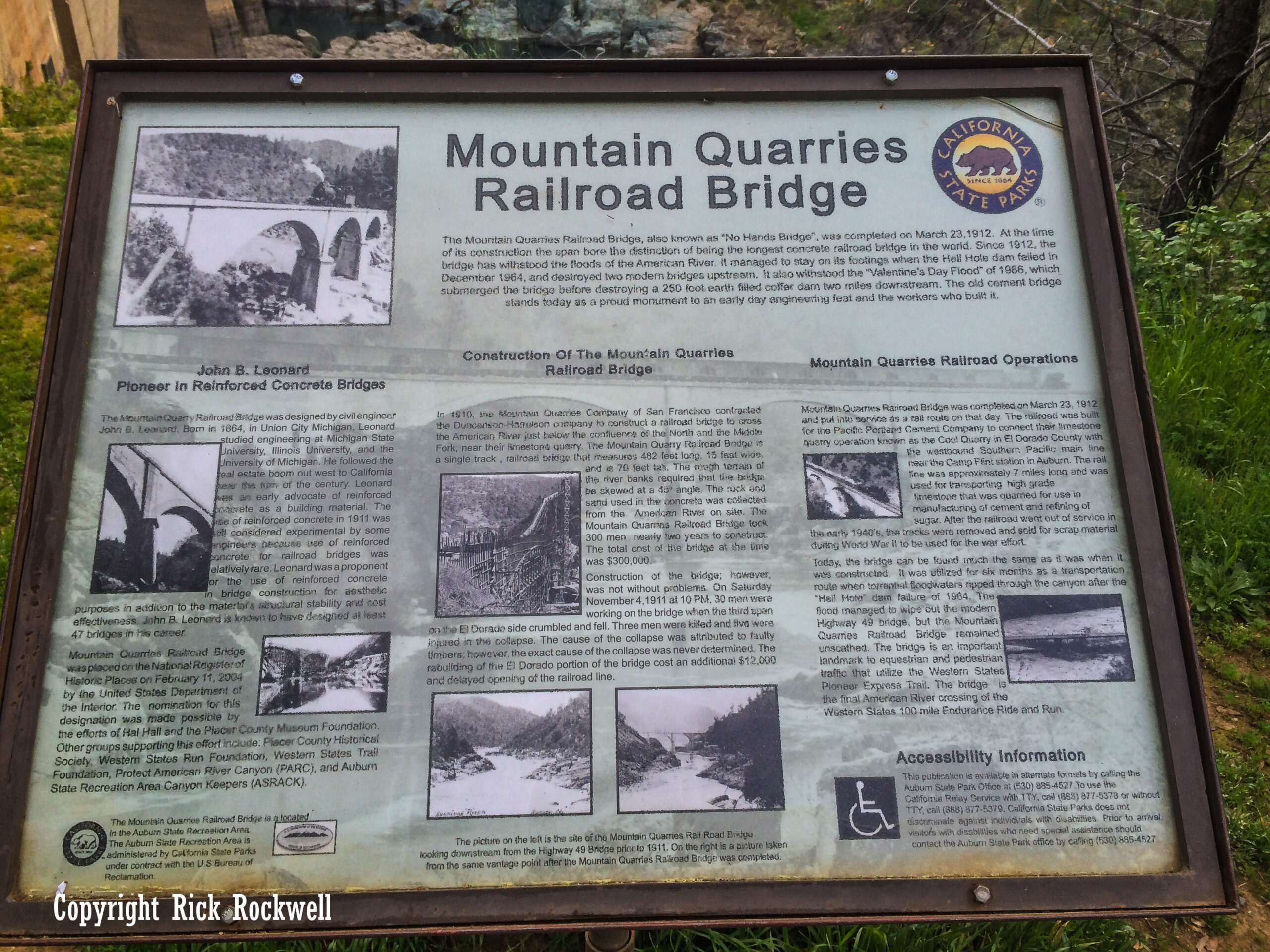 This bridge connected the limestone quarry in Cool to the railhead in Auburn so that the company could move its limestone; which was used in the manufacturing of cement among other things. Roughly 800 men worked on this bridge, costing a total of over $300,000. Once completed (on March 23, 1912) the bridge became the longest concrete arch bridge in the world. However, during the construction, three men died in November 1911 when the third arch collapsed.
